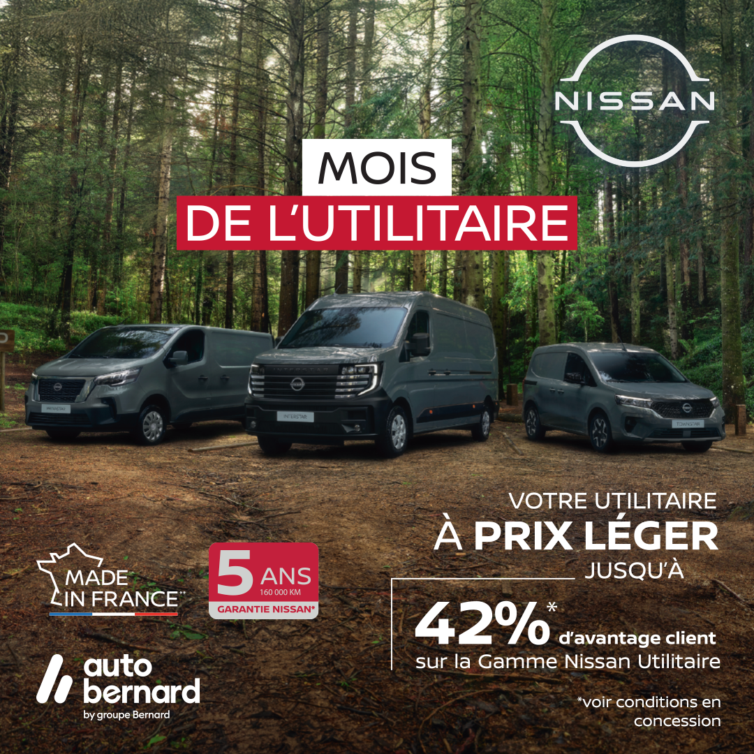 (1) 42% d’avantage client pour l’achat d’un NISSAN TOWNSTAR EV FOURGON 45 kWh ACENTA L1H1 avec chargeur embarqué 11 kW neuf, sur prix tarif au 01/12/2025 de 31 700€ HT, 18 390€ HT après déduction de 8 230€ HT de remise et 5080€ de prime CEE CertiNergy(2). 25% d’avantage client pour l’achat d’un NISSAN TOWNSTAR FOURGON TCE 130ch ACENTA L1H1 neuf, sur prix tarif au 01/08/2025 de 24 650€ HT, 18 490€ HT après déduction de 6 160€ HT de remise. 30% d’avantage client pour l’achat d’un NISSAN PRIMASTAR FOURGON L1H1 2T8 dCi 130 ACENTA neuf, sur prix tarif au 01/12/2025 de 34 550€ HT, 24 190€ HT après déduction de 10 360€ HT de remise. 27% d’avantage client pour l’achat d’un NISSAN INTERSTAR FOURGON L2H2 3T3 dCi 130 ACENTA neuf, sur prix tarif au 01/12/2025 de 36700€ HT, 26 790€ HT après déduction de 9910€ HT de remise. 26% d’avantage client pour l’achat d’un NISSAN INTERSTAR-e FOURGON 40 kWh L2H2 3T5 N-Connecta AC 7 kW / DC 50 kW neuf, sur prix tarif au 01/12/2025 de 47 600€ HT, 34 990€ HT après déduction de 7 530€ HT de remise et 5080€ de prime CEE CertiNergy(2). (2) Certificat d’Economie d’Energie non soumis à TVA. Offres non cumulables réservées aux artisans, commerçants, sociétés (hors loueurs, administrations, clients sous protocole), valables du 1er Février au 31 Mars 2026, dans la limite des stocks disponibles, chez les concessionnaires NISSAN participants. NISSAN WEST EUROPE SAS : nissan.fr *Garantie véhicule neuf 5 ans (limité à 160 000Km). **Fabriqué en France.
